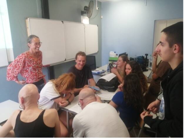 Nos presentan a varios compañeros y comenzamos la jornada en clase de Stephanie observando y participando en una actividad en español para romper el hielo y conocerse más. Consiste en tirar dos dados y colocarse en la casilla que indiquen (como si se jugase a Hundir la flota). En esta habrá una pregunta que responder o un reto a realizar.