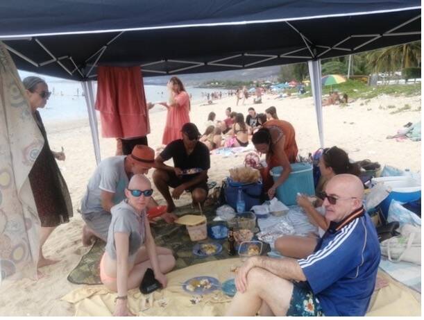El picnic se instala bajo una carpa. Nos ofrecen limonada para empezar. Nos bañamos y después probamos los platos que han preparado: samosas, carne de cerdo, varios pasteles de verduras, lichis...